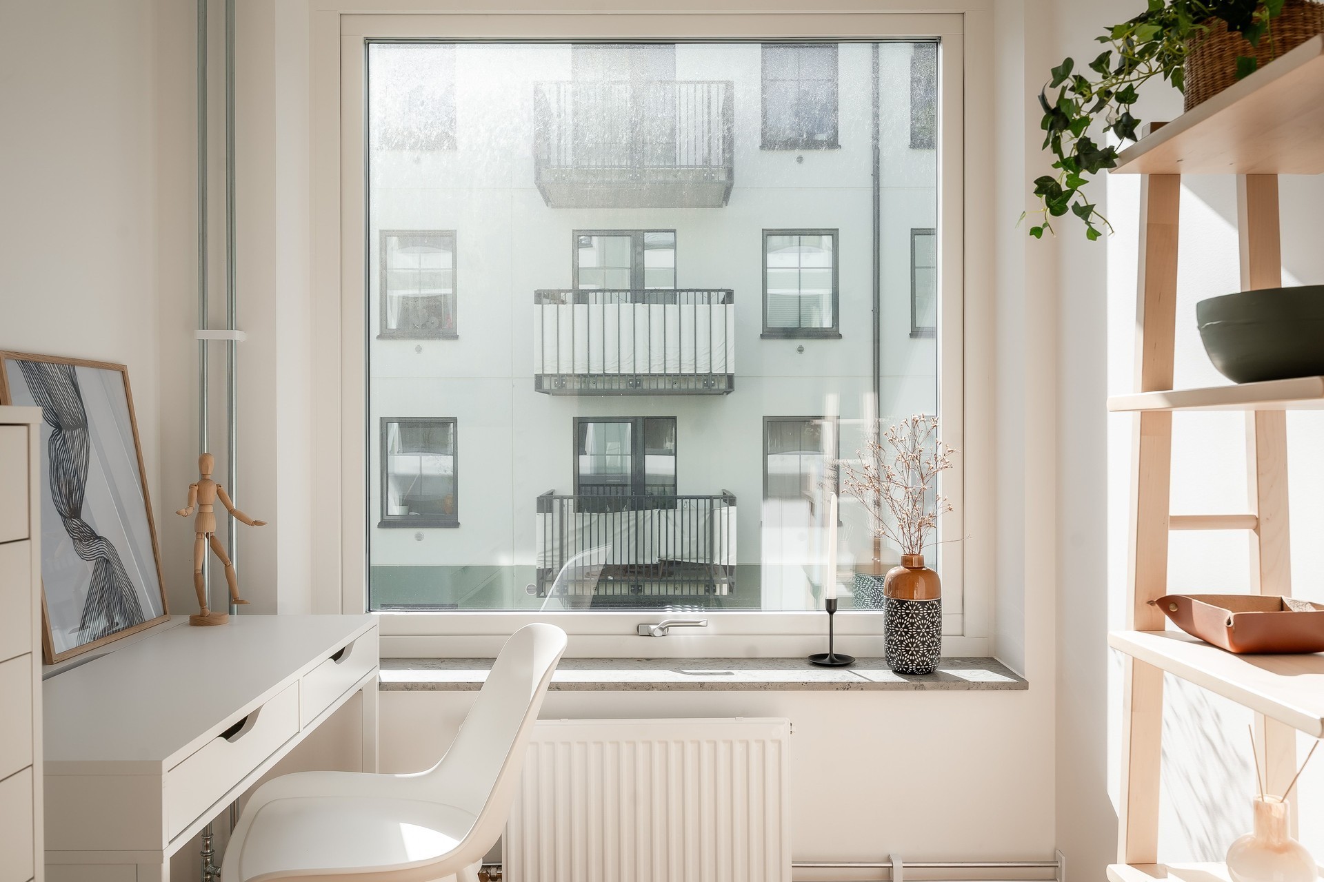 Lägenheten disponerar som 2,5 rok där "halvrummet" är lägenhetens förråd med stort fönster, perfekt att användas som arbetsrum.